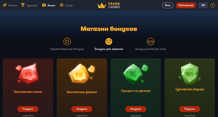 Зарегистрированному клиенту в скачанном Frank Casino на Андроид и Айфон предоставляются бездепозитные бонусы в виде бесплатных вращений. Действует вознаграждение на определенных игровых автоматах. Перед активацией награды, следует изучить условия его получения.